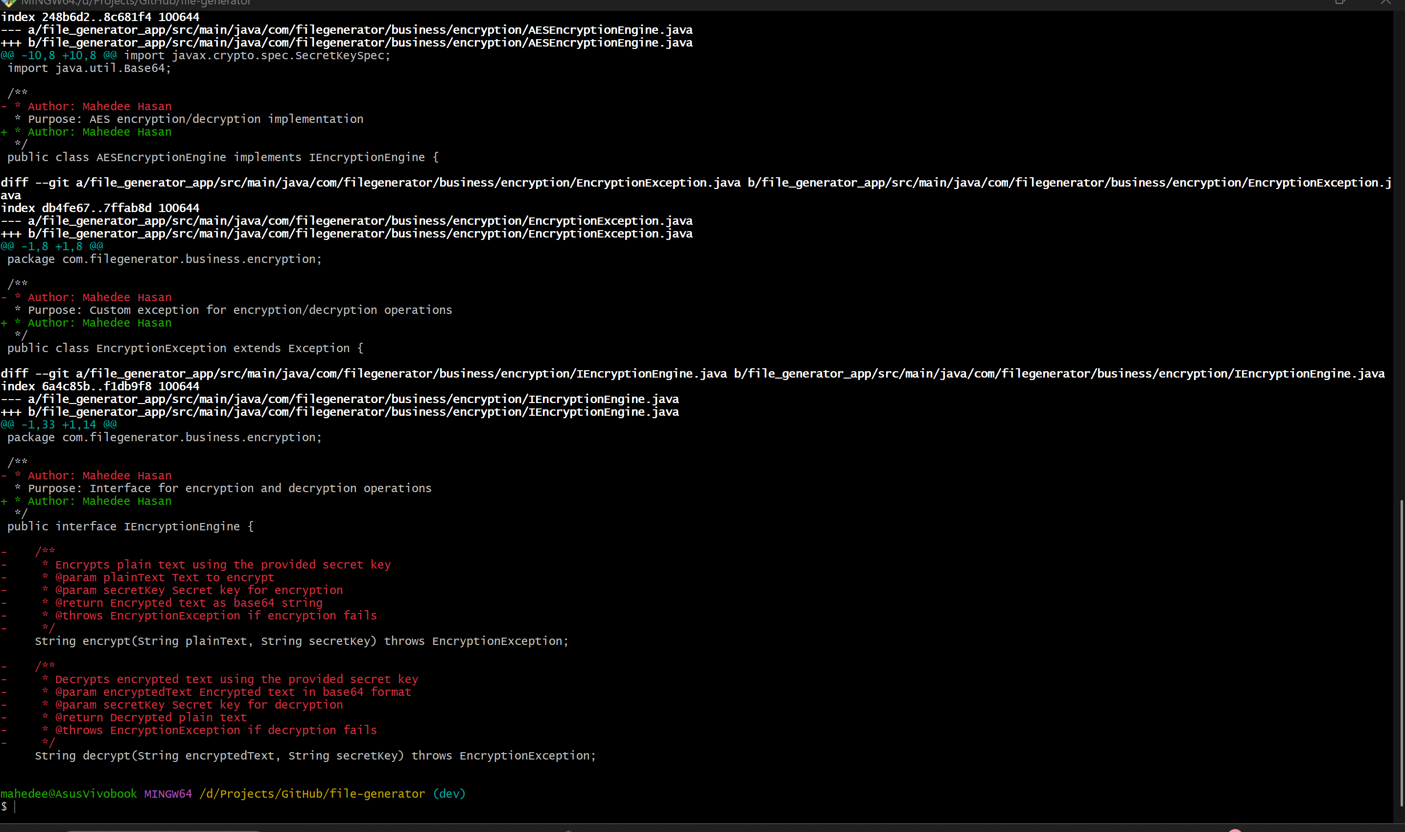 $ git diff origin/dev -- file_generator_app/src/main/java/com/filegenerator/business/encryption/AESEncryptionEngine.java