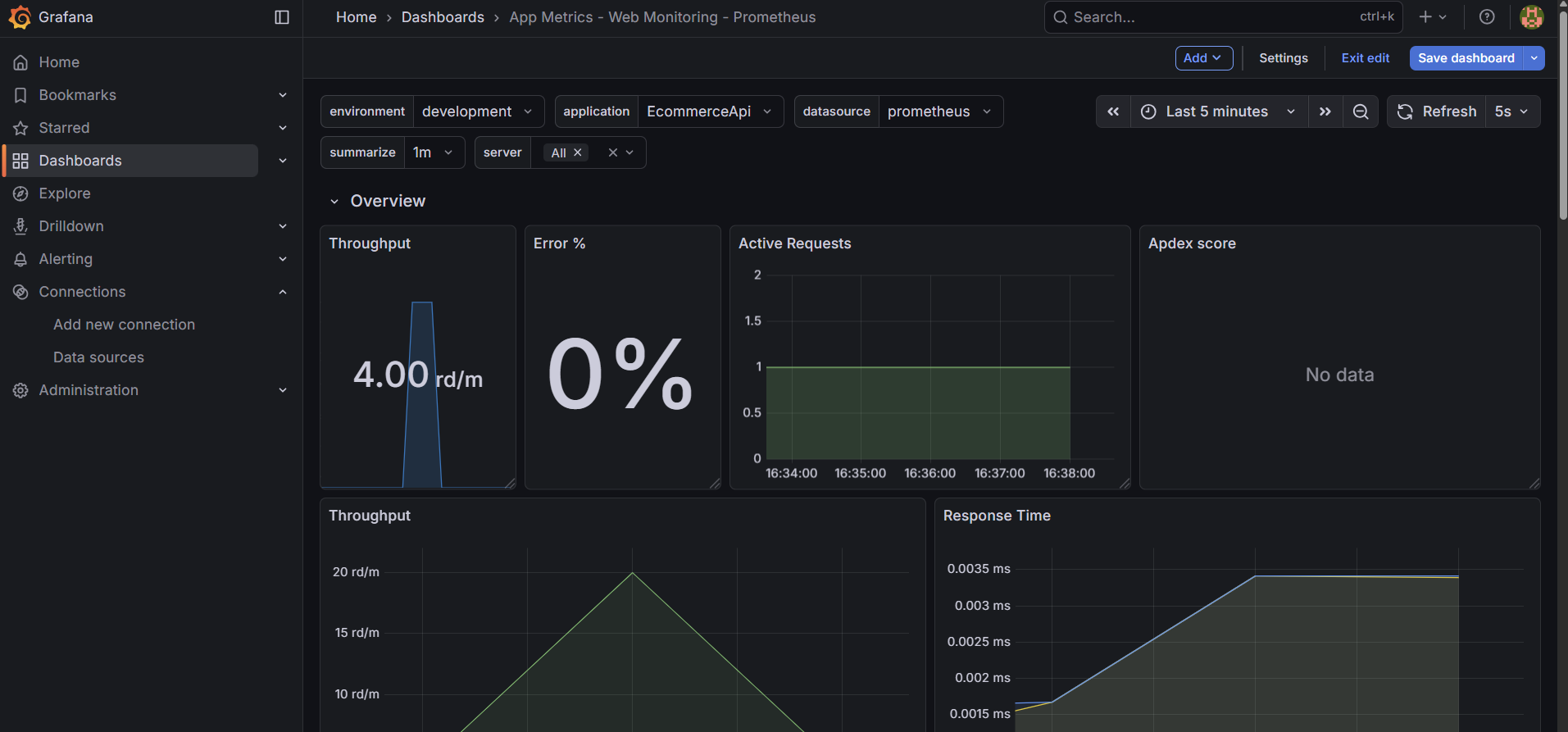 Conclusion Implementing metrics and dashboards for your .NET Core APIs using Prometheus and Grafana significantly enhances your application’s observability. By following the steps outlined in this guide, you can effectively monitor your API’s performance, track key metrics, and visualize data through customizable dashboards. This setup not only helps in identifying performance bottlenecks but also aids in proactive issue resolution, ensuring a robust and reliable application.