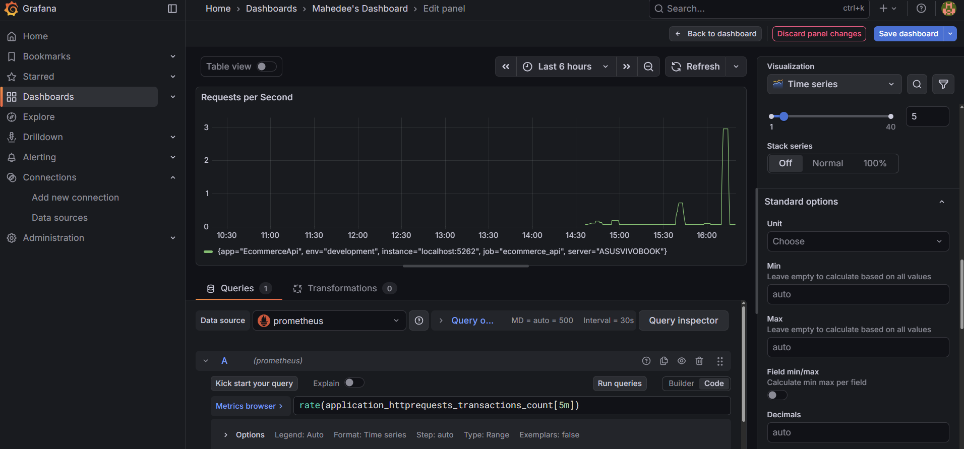 - After adding all the panels, save your dashboard. You should now see real-time metrics from your .NET Core API displayed in Grafana.
