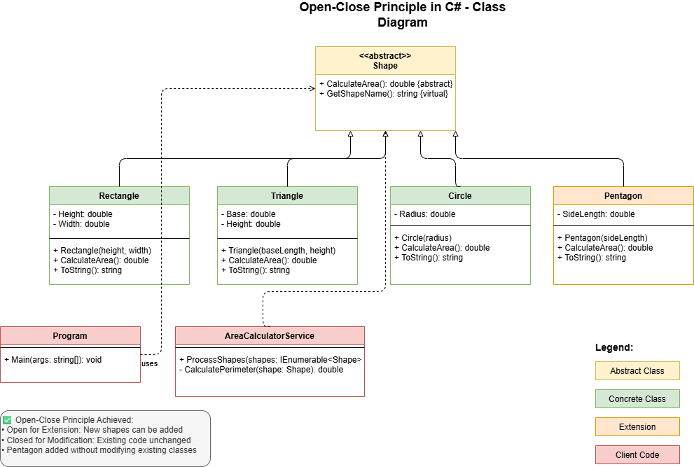 We implement the same problem abide by open close principle by the following way. Here Rectangle, Triangle and Circle class inherit the Shape class and implement CalculateArea Method. In this way, if you need to calculate area of x shape just add a class of x and then implement shape and calculate area of x without modifying exiting code.