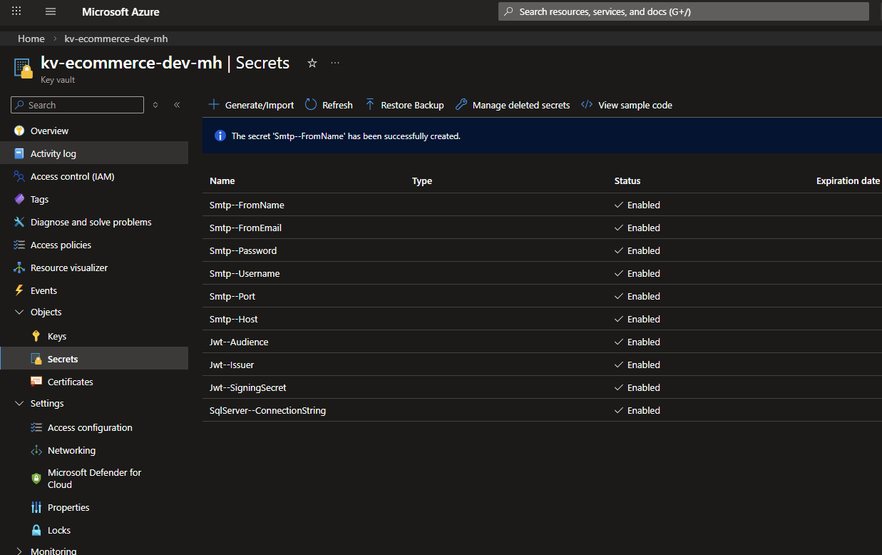 In this tutorial, you built a complete ASP.NET Core Web API application with secure integration to Azure Key Vault for managing sensitive configuration like database connection strings, JWT secrets, and SMTP credentials. You created a simple e-commerce API with user authentication, product management, and order processing features. The application securely loads all secrets from Azure Key Vault at runtime, ensuring that sensitive information is never hardcoded or stored in source control.