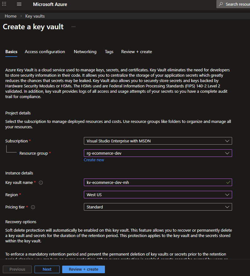 Field Value Subscription Your subscription Resource group rg-ecommerce-devKey vault name kv-ecommerce-dev-mh(must be globally unique)Region Same as your resource group Pricing tier Standard - Click Next: Access configuration.